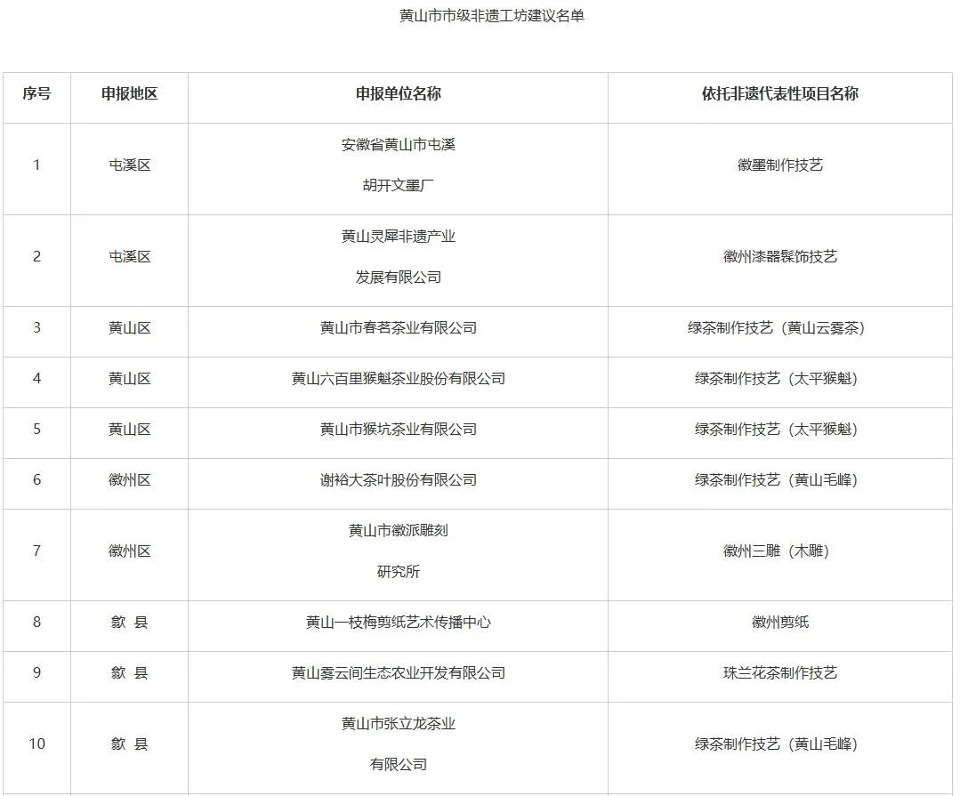 根據(jù)《安徽省文化和旅游廳安徽省人力資源和社會保障廳安徽省農(nóng)業(yè)農(nóng)村廳關于印發(fā)<安徽省非遺工坊管理辦法>的通知》要求,市文化和旅游局、市人力資源和社會保障局、市農(nóng)業(yè)農(nóng)村局聯(lián)合組織開展了市級非遺工坊認定工作。經(jīng)申報主體自愿申請、各區(qū)縣初審推薦、市級評審復核,形成市級非遺工坊建議名單,共19家,具體名單如下所示:
